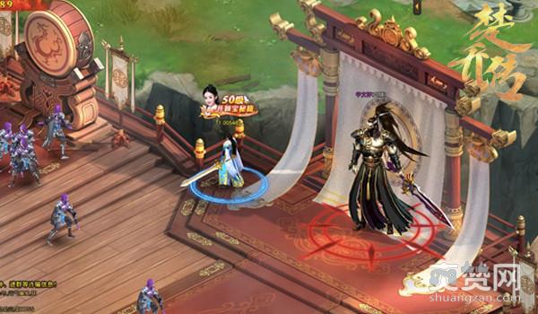 室外的场景打造讲究真实感,室内的场景则讲究氛围的烘托。极乐阁作为电视剧中典型的室内场景,展现出灯红酒绿、荒淫奢靡的特质。网页游戏37《楚乔传》打造了一个还原度很高的极乐阁。和电视剧一样,极乐阁都是以橘黄色和桃红色为主色调,配上挂灯和帘幕的装饰,营造出一种醉生梦死的迷幻场景。另外,玩家还能在这里碰见剧中被送进极乐阁便一去不复返的汁湘。