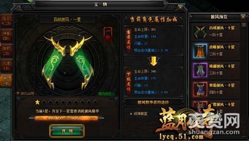 51《蓝月传奇》披风系统上线。玩家角色等级达到7转的玩家可在宝物页开启“披风”。