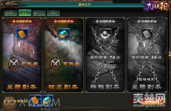 在XY游戏《九阴九阳》各类副本中,日常副本又分为:坐骑副本、披风副本、神雕副本以及坐骑副本的困难模式。坐骑披风以及神雕,可以说是玩家行走江湖的必备良品,只有每日完成一次副本,才能更加快速的提升这些物品的等阶,从而也提升了自己的实力!所以玩家们可千万不要错过日常副本的奖励喔!