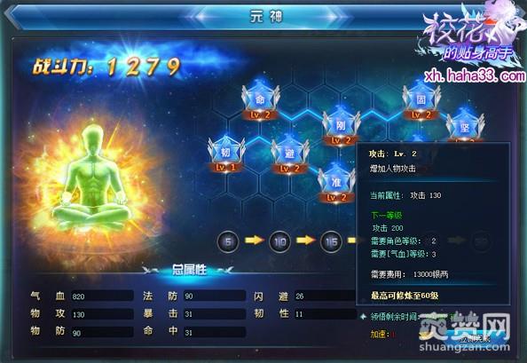 在《校花的贴身高手》游戏中,元神系统主要是修炼。修炼是有时间限制了,限制过后。角色会随机增中属性加成,包括:气血、攻击、防御、命中、闪避、暴击、韧性。