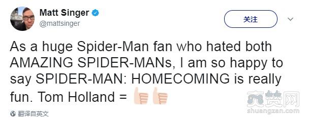 @Matt Singer:作为一个讨厌《超凡蜘蛛侠》的蜘蛛侠粉丝,我万分欣喜地表示《蜘蛛侠:英雄归来》棒呆了!荷兰弟赞赞!