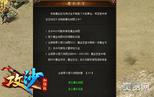 当全服玩家累计提交魔金拼图50次时,魔金密室将刷新一波魔金守卫,玩家击杀之可拾取大量的绑元掉落;当全服累计提交拼图达到500、1000次时,魔金密室中刷新BOSS魔金战将、魔金巨龙,击杀后有概率掉落高转装备!