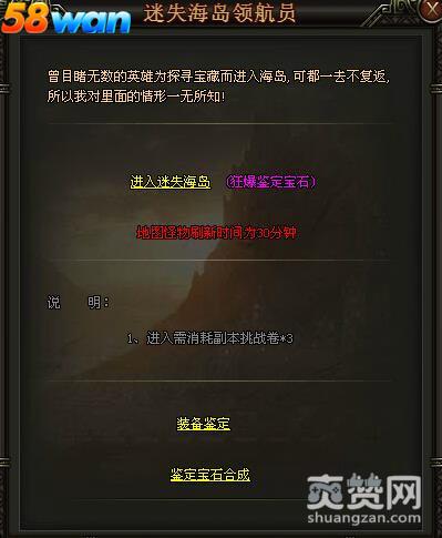 想要获得鉴定宝石,那么去迷失海岛找专业鉴宝大师吧.玩家消耗3个副本挑战卷轴就可通过铁血城NPC"迷失海岛领航员"进入迷失海岛,击杀鉴宝学徒有几率获得绿色鉴定宝石,击杀鉴宝大师有几率爆蓝色、金色鉴定宝石,boss30分钟刷新一次.想要宝石,先战斗吧!
