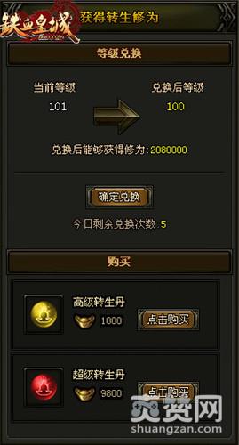 当然,这么逆天的属性对战斗力的增长是显而易见的,所以人物在达到100级以后通过降低自己的等级来兑换转生修为值,低于100级将不可降级兑换修为!每天限制兑换3次;另一个获得修为值的方法就是通过商城购买转生丹。高级转生丹,100级方可使用,双击后增加100W转生修为,超级转生丹,100级时使用,双击增肌1000W转生修为。这么逆天的属性,可以如此轻易的获得,还在等什么?快来51《铁血皇城》一战!