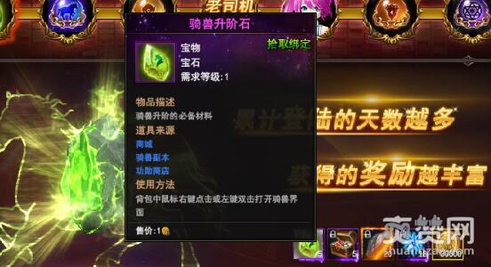 这就是号称第一天最闪耀的“骑兽升阶石”,傲天神印王座中第一天登录可以拿到5枚。虽说不能立马将骑兽升1级,但起码也能对骑兽系统的提升起到一定的作用。