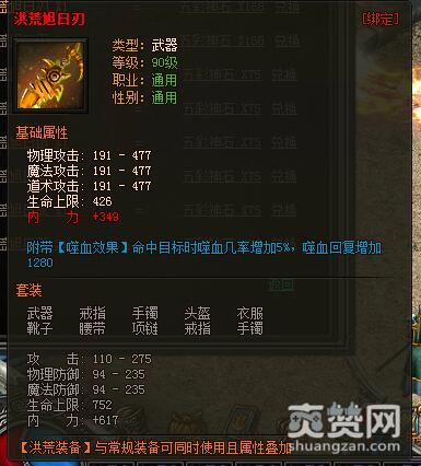洪荒旭日刃。类型:武器,等级:90级,职业:通用,性别:通用。基础属性——物理攻击:191-477,魔法攻击:191-477,道术攻击:191-477,生命上限:426,内力:+349。附带【噬血效果】命中目标时噬血几率增加5%,噬血回复增加1280。套装:武器、戒指、手镯、头盔、衣服、靴子、腰带、项链、戒指、手镯。攻击:110-275,物理防御:94-235,魔法防御:94-235,生命上限:752,内力:+617。【洪荒装备】与常规装备可同时使用且属性叠加。