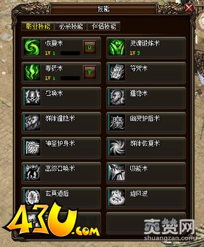 在43u《烈火战神》游戏中道士拥有恢复术、灵魂锻炼术、毒药术、符咒术、召唤术、遁隐术、群体遁隐术、幽灵护盾术、神圣术、群体恢复术、召唤术、吸能术、玄冥道盾、旋风波、冥狱足足15项技能没有之一!
