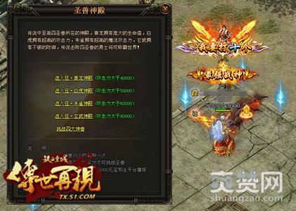 玩家攻击大于60000、80000的玩家点击铁血城NPC【圣兽神殿】—【挑战狂﹒神兽】可进入狂﹒至尊朱雀或者狂﹒至尊玄武,神兽每20小时刷新一次。神兽拥有强大的技能与攻击,必须拥有强大的实力, 并且配合各职业方可挑战。击杀至尊圣兽BOSS,将有机会获得神器、神甲、13转武器、14转首饰等极品道具。