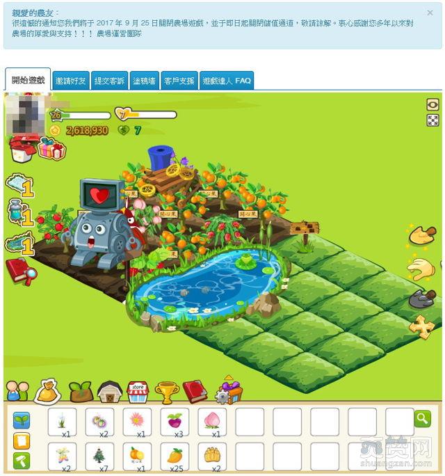 《开心农场(Happy Harvest)》是款在Facebook平台推出的农场经营游戏,玩家可种植农作物或饲养牲畜后采收,最后售出以赚取金币,同时也可以拜访好友农场或偷取他们的产物。游戏自推出至今已约8年左右的时间,近日官方宣布游戏将于2017年9月25日关闭,储值功能已于即日起关闭。