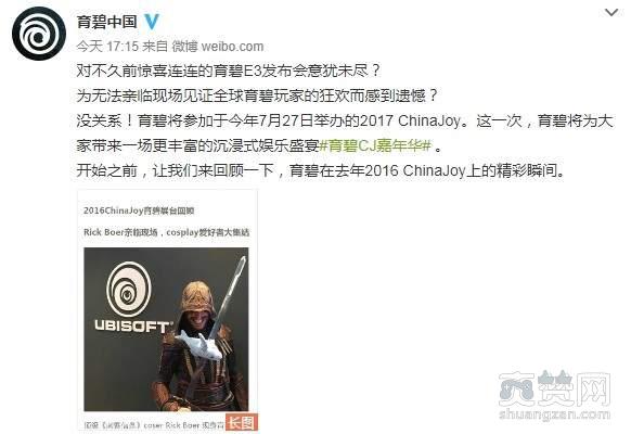 同时育碧中国在官方微博上还分享了2016年CJ上育碧参展的相关精彩回顾,除了Cosplay、VR体验等,还有《刺客信条:枭雄》、《孤岛惊魂:原始杀戮》等3A大作。不知道在今年E3上大出风头的《刺客信条:起源》《孤岛惊魂5》《骷髅与骸骨》等最新大作会在CJ 2017上亮相吗?