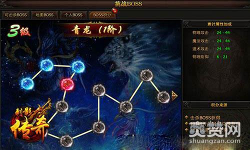 打BOSS赚积分!战斗力MAX! 萝卜玩《刺影传奇》BOSS积分有青龙、白虎、朱雀、玄武四个阶层,各分为12个等级,即12个魂点。每点亮一个魂点,就可获得相应的属性加成,魂点必须依次点亮,不可跳过。当前阶层魂点全部点亮之后,才可进入下一阶层。点亮魂点需要消耗相应数目的BOSS积分!