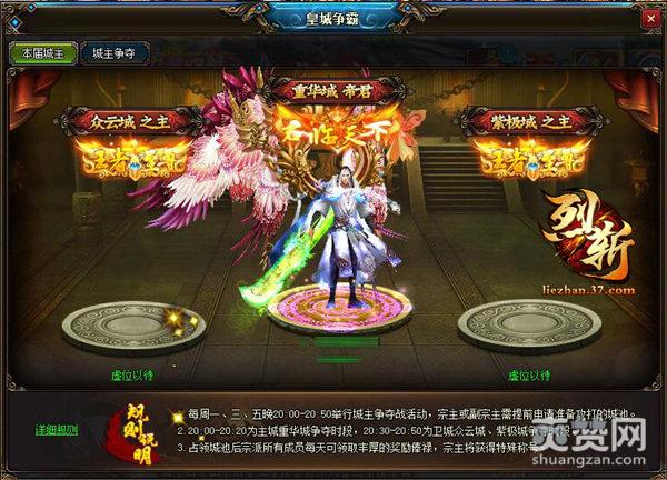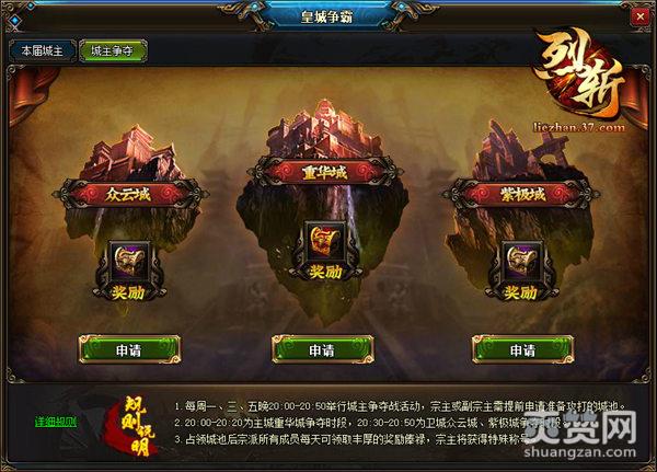 玩家如果想参加37《烈斩》皇城争霸活动,那么在活动开始前,需要由宗主或副宗主申请攻打城池,每次最多申请一个,申请后10分钟内不得更改申请。每个宗派最多占领一个城池,主城争夺失败的宗派可继续申请争夺卫城,活动将与邻近服务器跨服进行,在本服宗派战力榜排名前三的宗派可成功申请进行城池争夺。