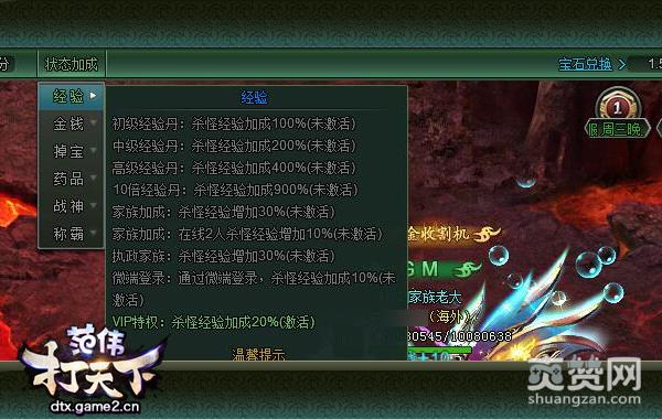 新版《范伟打天下》导航栏绝对称得上是黑科技,用非常小的占地却可以显示大量的信息,这得益于丰富的下拉菜单。当玩家的鼠标悬停在导航栏中:状态加成、宝石兑换、现金提取等等内容上时,系统将会自动弹出相应菜单。
