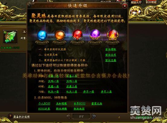 除了介绍各种聚灵珠的价值和作用,还介绍了快速获得装备积分的方式。一种是野外挂机,拾取并使用装备精华,从45级~70级的挂机区域一目了然。最牛逼获得更多装备积分的方式自然是拿到更多好装备用于回收,击杀BOSS则成为赚取高额装备积分的最佳方法。傲天攻沙加强版游戏内个人BOSS、未知暗殿、世界BOSS、雷霆之阵、BOSS之家、转生神殿、挑战地图,无一不是获取高级装备的好地方。