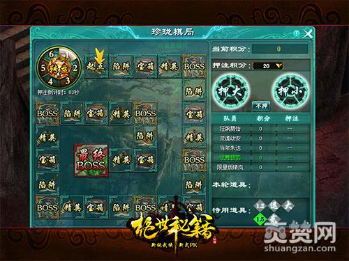 游戏主城的“异域奇人”是棋局的传送使。“珍珑棋局”玩法内含有“宝箱”“陷阱”“精英”“BOSS”多个环节,玩家每次押注积分后即可用扔骰子的方式前进,进入相应关卡杀怪通关拿奖励。在棋局中可以使用多种道具卡,让游戏的趣味大大增加。道具卡不仅能让积分加倍增加,还有无数隐藏宝藏可以发掘。“珍珑棋局”需要5人组队方可进入,快来跟小伙伴一起下棋拿珍宝,称霸武林指日可待。