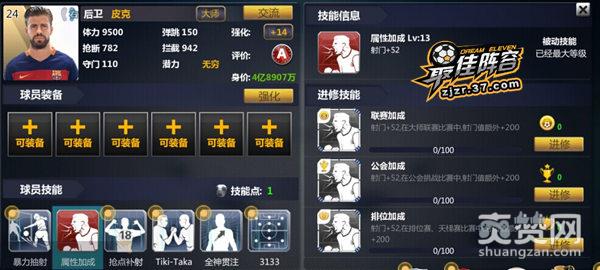 球员强化+13后,可开启属性技能进阶,届时可以选择联赛加成、公会加成、排位或天梯(PK)方向的技能进阶,在相应的比赛中还可获得更高属性的技能加成。