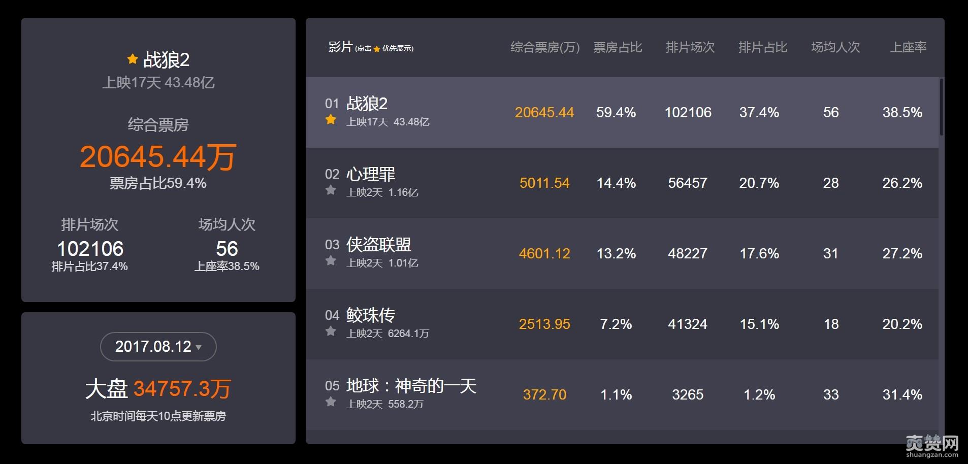 虽然排片和上座率已经有所下降,但《战狼2》的票房成绩依然非常稳定。刚上映两天的《心理罪》和《侠盗联盟》分别占据二、三名的位置,两部影片在周六的票房占比为27.6%,虽然远不及《战狼2》,但也已经票房破亿。