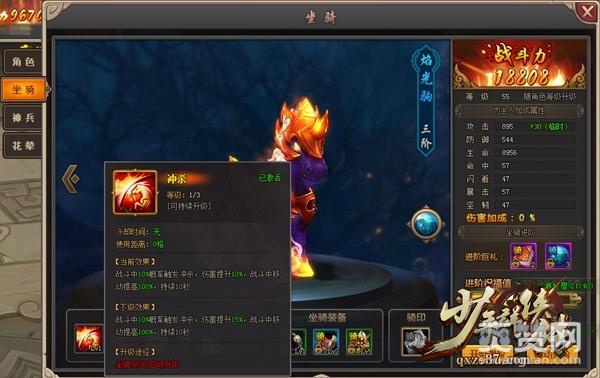 坐骑不仅是玩家最忠实的小伙伴,同时也是玩家所向披靡的大杀器之一。在坐骑界面中,玩家不仅可以详细地看到当前坐骑为主人带来的各项附加属性加成,也能了解当前坐骑拥有的坐骑技能。坐骑技能包括冲杀、践踏、战意等,激活后将在战斗中触发酷炫的特殊战斗效果,让玩家爆发出最强战斗力,体验最生猛的冲杀战斗!