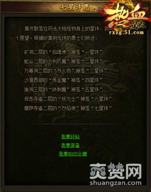 人们都常常说,向着流星许愿,你所许下的愿望就会成真,要小编说与其期待这些不靠谱的言论还不如去热血战歌中试试七星许愿呢,不管是需要经验还是需要装备这里都可以满足你哦。传说中玛法大陆上散落着七颗星珠,每颗星珠都有固定怪物进行镇守,集齐七颗星珠时,就可以满足他的一个愿望。这个说的就是七星许愿哦,在这个副本中怪物每三十分钟刷新一次,每次击杀后固定掉落星珠。