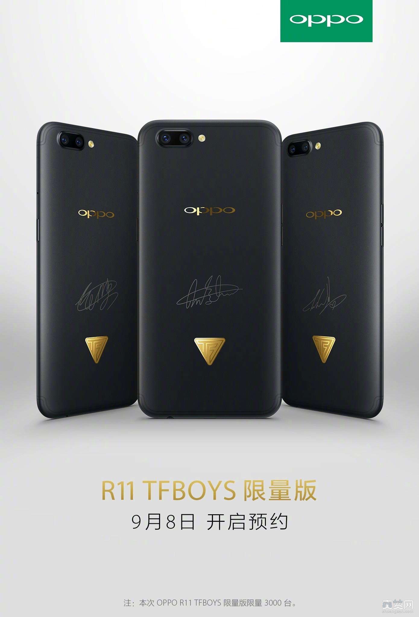 近日,国产手机厂商OPPO就宣布推出一款TFBoys定制版R11手机,从宣传海报来看,这款手机背部采用黑金配色,OPPO的Logo和TFBoys的标识都采用金色配色,中间还有TFboys的签名。