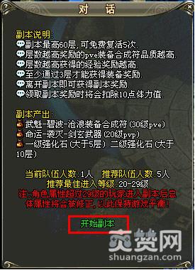 副本一共有60层,玩家每天可免费复活5次。层数越高,奖励的PVE装备合成符品质也就越高,同时,得到的经验奖励也就越多。玩家要至少通过5层才能获得装备奖励合成符。在离开副本后就可获得副本奖励,领取副本奖励时会扣除10点体力值哦!