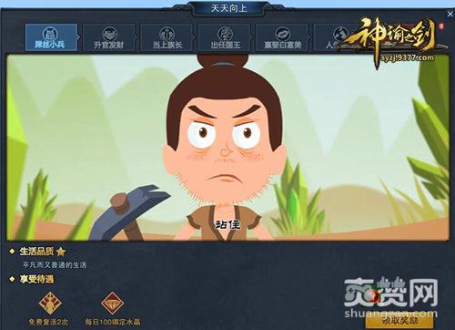 9377《神谕之剑》天天向上一共分为“屌丝小兵”、“升官发财”、“当上族长”、“出任国王”、“赢取白富美”和“人生巅峰”等6个阶段。