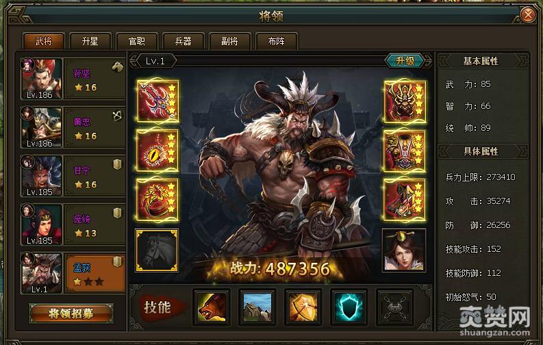 1级状态下,如果你把战斗科技里的盾兵科技都点满,再把所有武器都神铸到神级武器,兵器也全满,带副将大乔的话,1级的孟获战力可以达到487356。如果你没有给孟获携带任何武器,若是卸掉所有的武器,那么孟获的战力就只有230174。上图是全兵器全神武带副将大乔时和什么都不带的数据,可以借鉴一下。