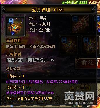 蓝月神链。类型:项链,等级:无级别,职业:全职业。基础属性——取决于所融合装备的基础属性。灵魂锁链:【蓝月头盔】闪避概率增加2.0%。特殊效果——【融合Lv1】可与5转及以上项链融合,获得其130%基础属性。【神佑Lv1】该装备掉落几率降为原来的50%。
