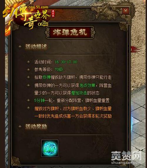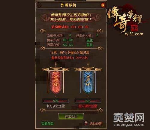 51《传奇世界》阵营大战的战场被称为“炸弹危机”,之所以如此称呼是因为地图中央地带会有一个可以拾取的震天雷 ,虽然拾取后会接受一个BUFF,受到的伤害加深,但是携带震天雷状态下接近敌方阵营旗帜可以产生对旗帜伤害的效果。而且携带状态下被击杀震天雷就会掉落地面,天雷则开始倒计时读秒,读秒结束后爆炸,同事震天雷接近旗帜也会自动爆炸。甚至在战斗中,双方阵营中还会刷出一些小炸弹,供双方阵营的玩家拾取使用。所以,战斗中时刻都有可能遇到炸弹危机哦!