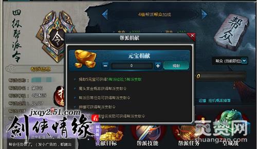 帮派捐献,分为铜钱捐献和元宝捐献,5万铜币可以获得1帮派经验,1帮派贡献。5元宝(非绑定)可以获得5帮派经验,5帮派贡献。这里建议还是捐献铜币,毕竟这游戏铜币的获得难度不大,而且需求量一般,大部分玩家都有充足的铜币富余,而非绑定元宝是需要充值的。在游戏中选择一个好的帮派可以在前期获得更多的奖励,有利于前期快速成长。