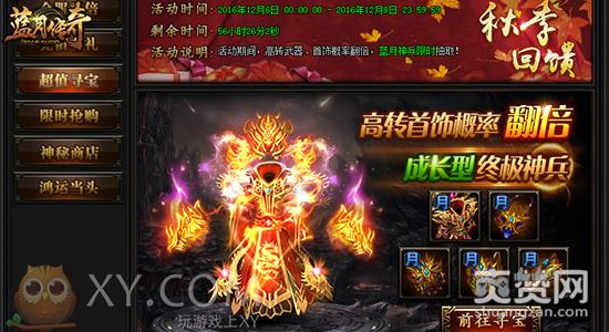 蓝月之上,传奇之巅!XY游戏《蓝月传奇》全民回馈重磅启动!磨砺你的兵器,燃起你的热血!参与福利活动,效率提升战力!任何人都不能阻拦你的崛起之路!让你的实力在这次活动中突飞猛进,谱写属于自己的传世凯歌吧!
