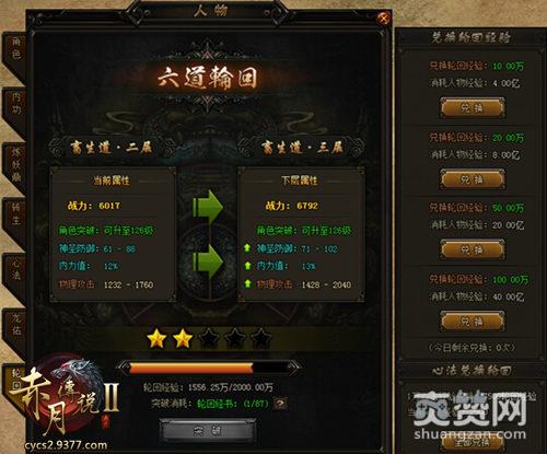 9377《赤月传说2》六道轮回除了天神道之外,其他五道都分为5层,每提升一层都能提升大量属性和战力。玩家提升了六道轮回等级后可以提升人物等级上限,新版本玩家可以升到高至132级。