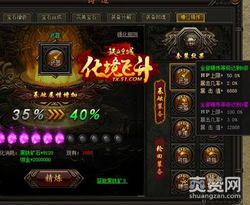 当我们获得矿石,在存足金币,那我们可以开始精炼槽位来获得强力的属性,而槽位也分为基础装备槽位和轮回装备槽位,所有槽位精炼每一级都有相应属性的增幅,当基础和轮回的精炼统一升级到一定的等级还会激发套装精炼效果。