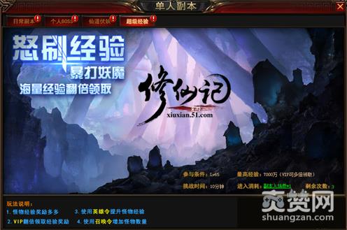 51《修仙记》一款兼具传统ARPG和MOBA即时战斗的史诗级网游巨作,以全新的修真世界为背景,妖族大举侵犯神族,三界大乱,神族内部出现巨大的阴谋,作为三界众生的你是选择一统三界还是拯救天下苍生?独一无二的境界系统带你领悟全新世界,更有精美的战魂、侍卫伴随你征战三界!千人同屏的震撼场面,带你感受不一样的修真。51《修仙记》中的单人副本为大家准备了多种玩啊,包括日常副本、个人BOSS、仙道伏妖、超级经验,想要狂收经验的玩家就快来体验超级经验副本吧。