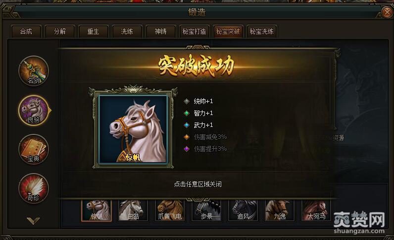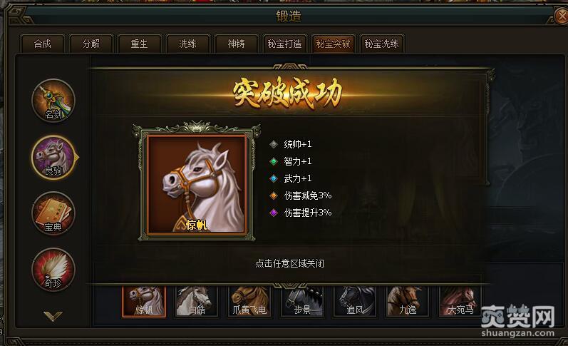 今天我们先依次选择锻造-秘宝突破-良驹-第一匹良驹惊帆,进行突破吧。
