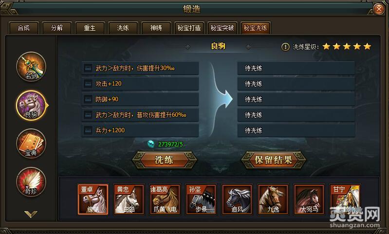 至此为止,突破全部完成。我们细细观察后发现,这匹良驹有三个属性增加的被动技能,所以受用范围要比别的良驹广些。而且剩下的两个被动技能一个有防护作用,一个有进攻意识,都是非常赞的技能。总体来说,虽然这匹良驹和特殊良驹蚩尤象龙相比差了下,但在普通良驹是非常出众的。因此,这匹良驹适合我们首发阵容的五人任意一人使用。这里小编是给董卓使用,大家也可以根据情况选择别的良驹,董卓由于武力偏高,所以应该这样洗: