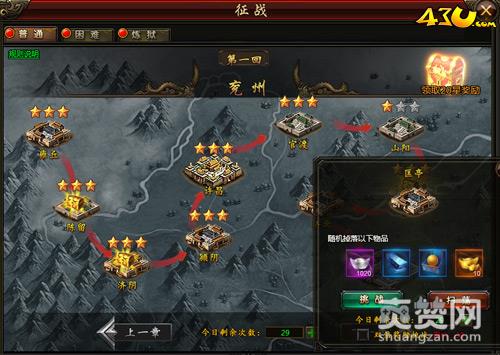 想要强大势力,43u《霸将三国》征战绝对是个好途径,在征战中有普通、困难和炼狱三个难度,小伙伴们可以自由选择挑战难度,从雍丘到许昌再到濮阳一路走来到处都是小伙伴们的战斗回忆,挑战过的关卡还可以通过扫荡来快速获得奖励!每个章节挑战累计达到相应星级还可以领取银两和装备强化石奖励哦!