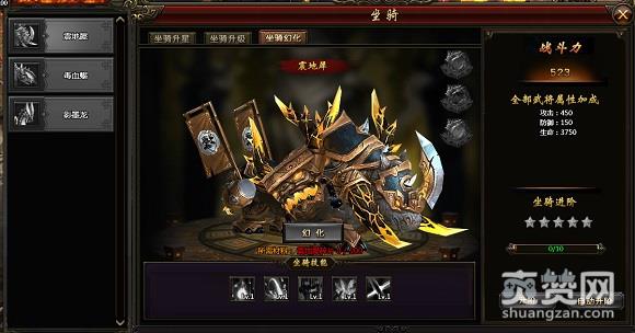 坐骑幻化,一共可以幻化三种坐骑外观,永久增加所有武将属性,分为地震犀,毒血蝎,隐墨龙,需要100和碎片合成。游戏王国《霸将三国》坐骑升阶升级幻化的材料可以在击杀BOSS,商城,活动,征战中获得。