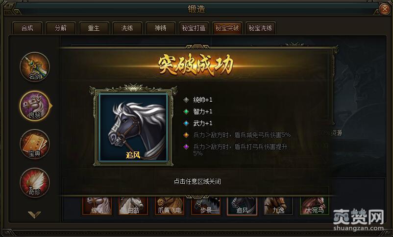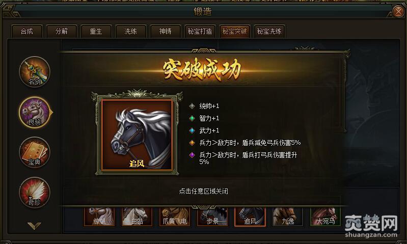今天我们先依次选择锻造-秘宝突破-良驹-第五匹良驹追风,进行突破吧。