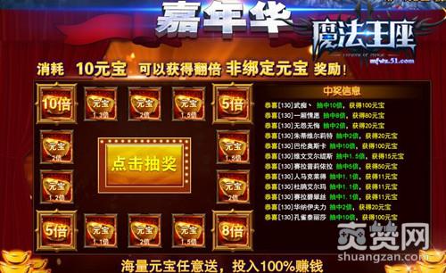 最后一种方法就非常有意思啦,也是十分考验你的运气的。“噔噔噔噔”超级嘉年华闪亮登场,不用担心抽到谢谢参与,因为在51《魔法王座》为了回馈广大玩家,超级嘉年华是必中奖的,最低1.1倍包你不亏哦~最高10倍绑元大奖是不是让你眼馋了呢!值得注意的是,参加超级嘉年华的活动是需要用元宝来抽取绑定元宝,所以推荐给小R玩家哦~假设我们投入50元宝,抽中5倍赔率,分分钟入手250绑元!