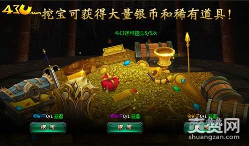 43u《霸将三国》中的挖宝可是获得大量银币和稀有道具的好途径!挖宝分为铜铲子、银铲子和金铲子,想要获得这三种铲子就去完成历练任务吧!使用不同的铲子可以获得不同数量的银币奖励,铲子等级越高获得的稀有道具数目越多哦!小伙伴们每天可以挖宝5次!这个次数可以哈!