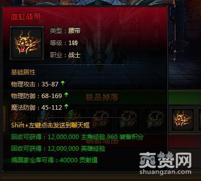 魔会掉落深渊恶魔徽章、血虹战盔(1转)、血虹法盔(1转)、血虹道盔(1转)、血虹战链(1转)、血虹法链(1转)、血虹道链(1转)、血虹战带(1转)以及血虹法带(1转)。