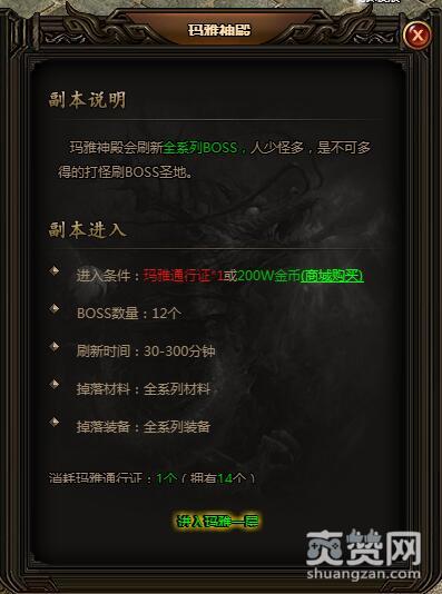 深渊恶魔第二个所在地位于玛雅神殿之中。进入前同样也要到商城去购买1个玛雅通行证,如果不想买也没关系,花200万金币也能进入。