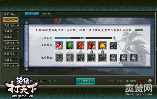 在《范伟打天下》的门派技能系统,获取、升级技能依然是免费即可。