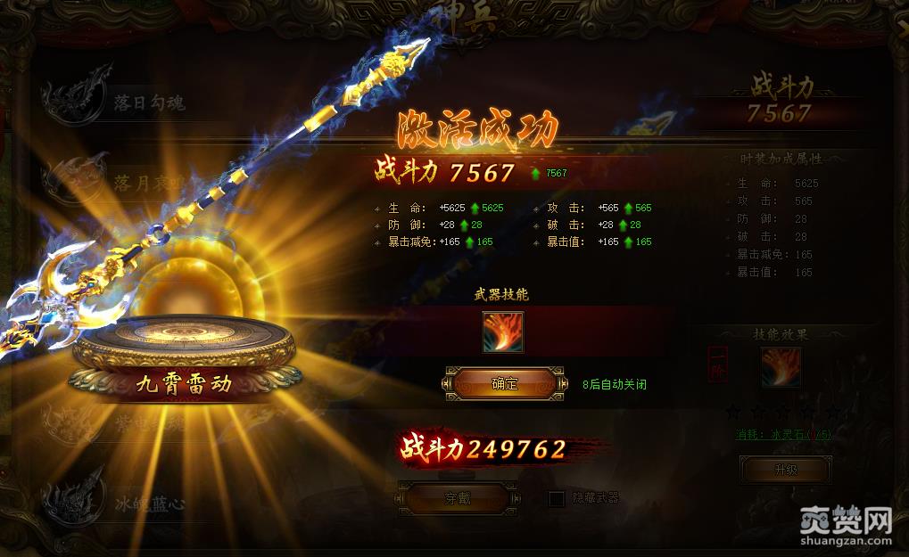 当玩家在线时长达8分钟后即可开通神兵功能,此时可免费获得第一把神兵——落月哀鸣。神兵可以增加人物角色的各项属性,提升神兵的阶数,不只增加更多的属性,更是可以强化神兵技能。神兵进阶需要消耗五灵石,该道具可通过商店,副本,击杀BOSS等方式获得。每颗五灵石可提升神兵当前阶数的星级,当神兵星级达到五星时,神兵将进阶到下一阶。神兵进阶成功后,将获得更厉害的技能和更加强大的属性。