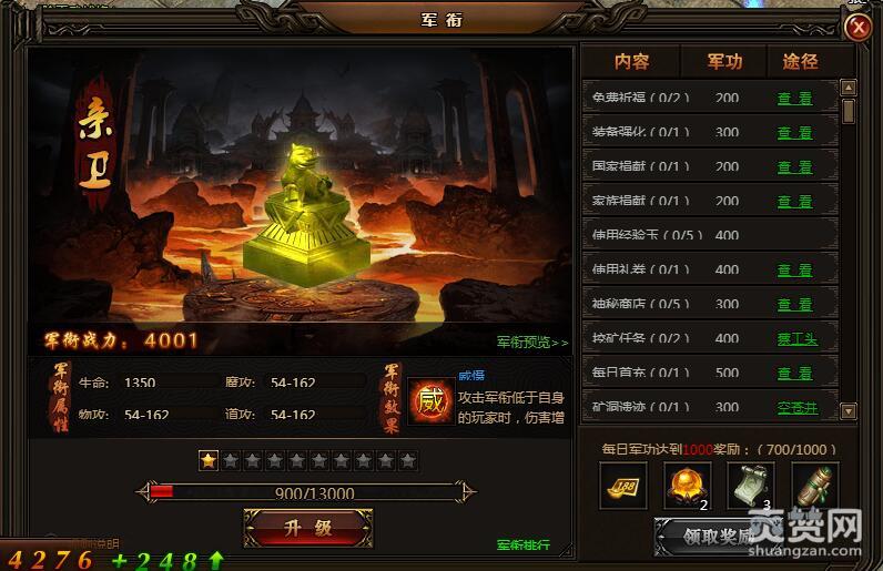 玩家可以完成每天的日常任务、日常活动等等,来获取一些军功值。诸如使用经验玉、使用礼券、挖矿任务等,都能够获得一些军功值奖励。玩家提升自身的军衔等级,除了可以获得一些军衔属性加成外,还能够获得一个特殊的攻击效果,那便是攻击军衔低于自己的玩家时,伤害额外增加相应的比例。