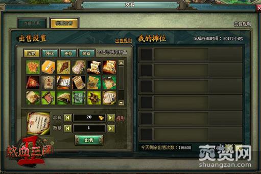 玩家在30级可购买道具,在50级只要摆摊,就可出售道具。玩家最大的摆设摊位不可超过10个,每个摊位上可以摆放一种道具,此道具必须是非绑定的,数量不能超过10个,交易要设定道具的最高和最低价格,用元宝交易,每次交易还需少量元宝做税收哦!