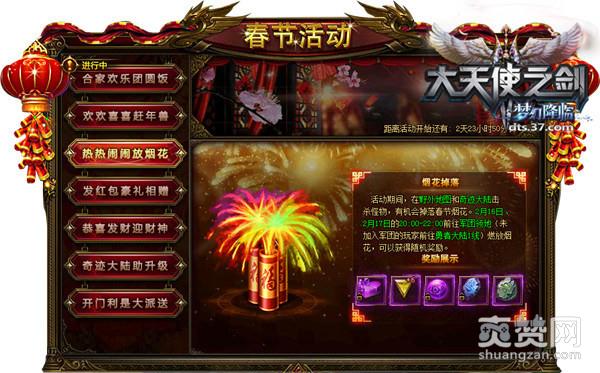 37《大天使之剑》的玩家在参与【热热闹闹放烟花】活动时,首先要在野外地图和奇迹大陆击杀怪物,即有机会拾取掉落春节烟花,然后在2月16日、2月17日的20:00~22:00前往军团领地(未加入军团的玩家前往勇者大陆1线)燃放烟花,可以获得随机奖励。