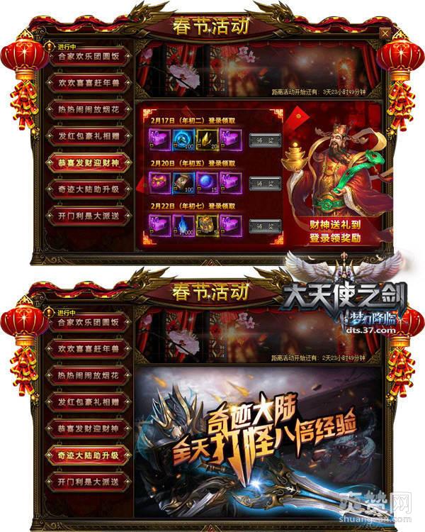 除了上述活动,37《大天使之剑》还有一些适用于要去拜年没太多时间上线的玩家参与,【发红包豪礼相赠】活动开启期间,玩家只需要在游戏内发红包,即可获得珍贵材料;【恭喜发财迎财神】最为简单,在2月17日、2月20日、2月22日这三天登陆游戏,最后还有【奇迹大陆助升级】,在活动期间,玩家全天打怪有八倍经验,机会难得,要抓紧参与哦!