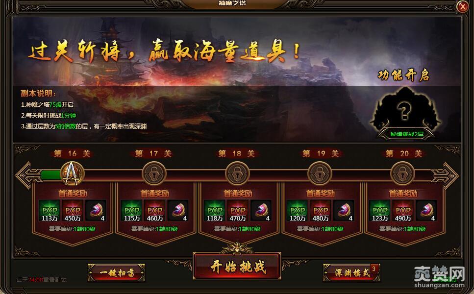 之前我们已经介绍过了第16层到第25层的boss分布,也激活了神盾。下面我们从第16层的BOSS开始打起。如果你登陆游戏后发现仍旧是挑战第一层BOSS的话,那你一定忘记了一键扫荡。